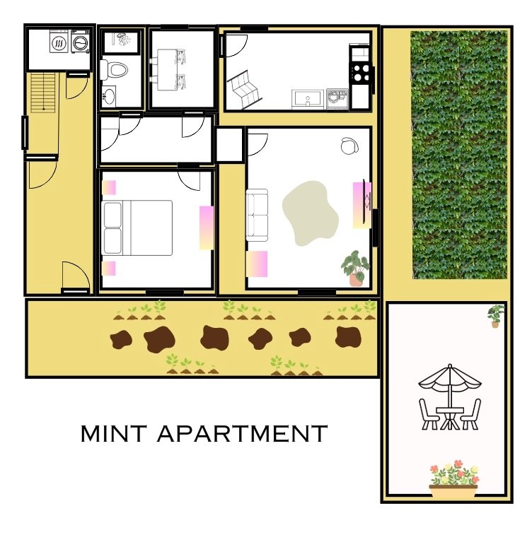 Das Mint Apartment ist die kompaktere, besonders charmante Unterkunft von KarlsbadLove. Mit rund 60 m² Wohnfläche, separatem Schlafzimmer und privatem Vorgarten eignet es sich ideal für Paare, Alleinreisende oder kleine Familien.